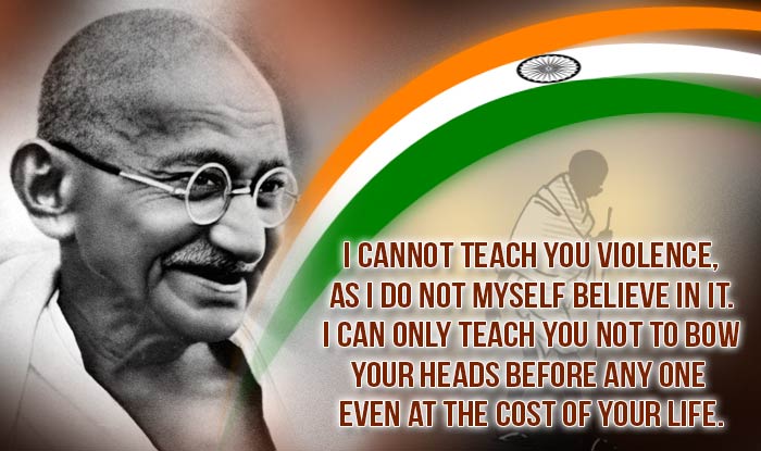Quote reads: I cannot teach you violence, as I do not myself believe in it. I can only teach you not to bow your heads before any one even at the cost of your life